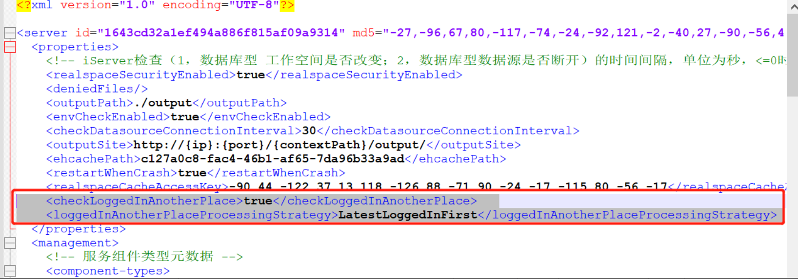 【解决办法】在 %SuperMap iPortal_HOME%/webapps/iportal/WEB-INF 目录下的 iserver-system.xml 文件中的 节点下,增加异地登录检测的相关配置(粗体部分)。详情请参见:iServer 配置文件说明。 具体示例如下所示: ... <!-- iServer检查(1,数据库型 工作空间是否改变;2,数据库型数据源是否断开)的时间间隔,单位为秒,<=0时表示从不检查。--> true ./output true 30 http://{ip}:{port}/{contextPath}/output/ true -37 80 99 -61 -77 8 50 44 -71 90 -24 -17 -115 80 -56 -17 true Notifying ... 其中:节点为是否开启异地登录,true 表示开启异地登录。 节点为异地登录处理策略,checkLoggedInAnotherPlace 为 true,此配置才生效。可选值包括:Notifying、LatestLoggedInFirst。Notifying,通知模式,代表同一账号可同时登录到多台主机中,且在登录时会通知当前检测到该账号的异地登录情况;LatestLoggedInFirst,最新登录优先,代表同一账号同一时间只能登录到一台主机中,登录时也会通知当前检测到的异地登录情况。与通知模式不同之处在于,上一次在其他主机登录的账号会被自动注销。若开启了异地登录,即配置 checkLoggedInAnotherPlace 为 true,但未配置异地登录处理策略,默认会使用 Notifying 模式。 具体设置如图: