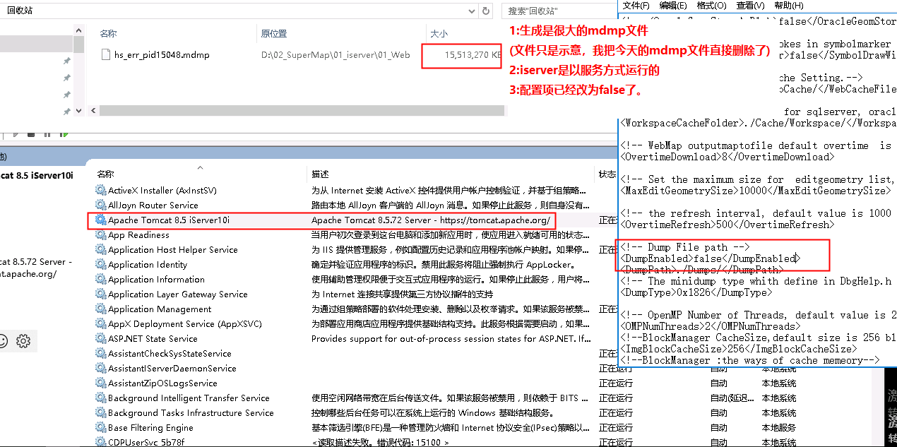 已经在 iserver安装目录\support\objectsjava\bin\SuperMap.xml文件里,把标签<DumpEnabled>true</DumpEnabled>里true改为false了。