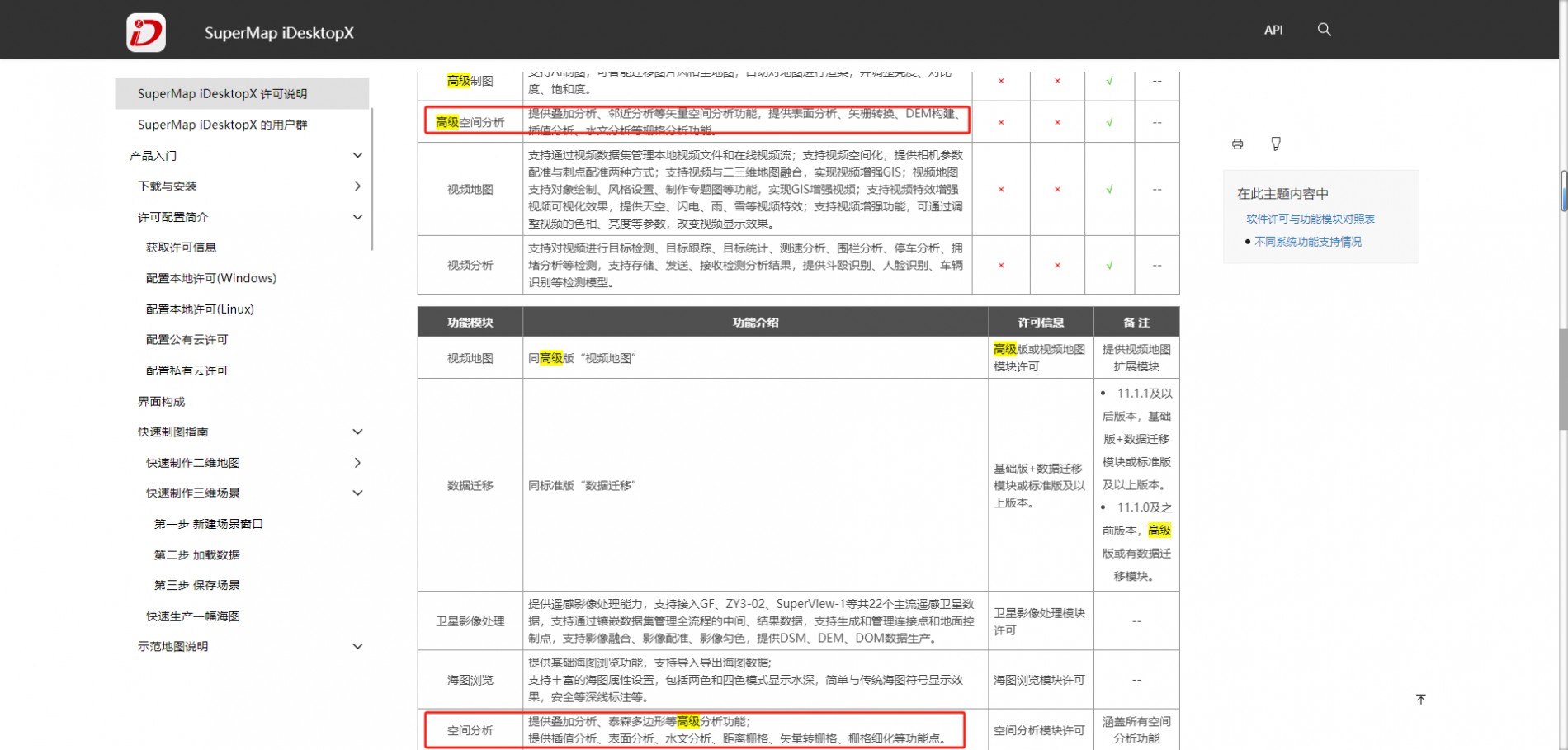 【问题原因】文档描述不准确,属于文档缺陷,不能覆盖所有。 【解决办法】实际情况是 扩展模块中的空间分析=基础空间分析+高级空间分析+其他(插值分析、表面分析、水文分析、距离栅格、矢量转栅格、栅格细化等)。