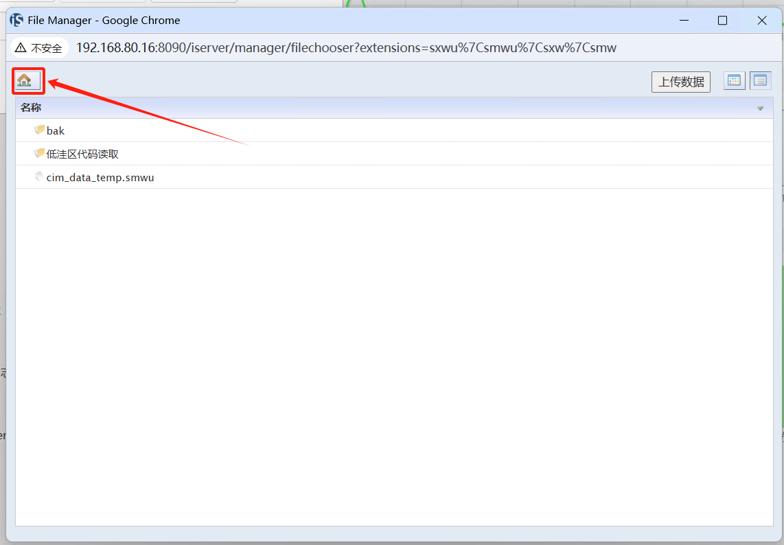 【问题原因】iServer设置了文件管理根目录,对可访问的目录做了限制。 【解决办法】进入iServer管理页面-高级-全局设置-文件管理设置,将“文件管理根目录”的参数清空并保存,然后重启iServer。