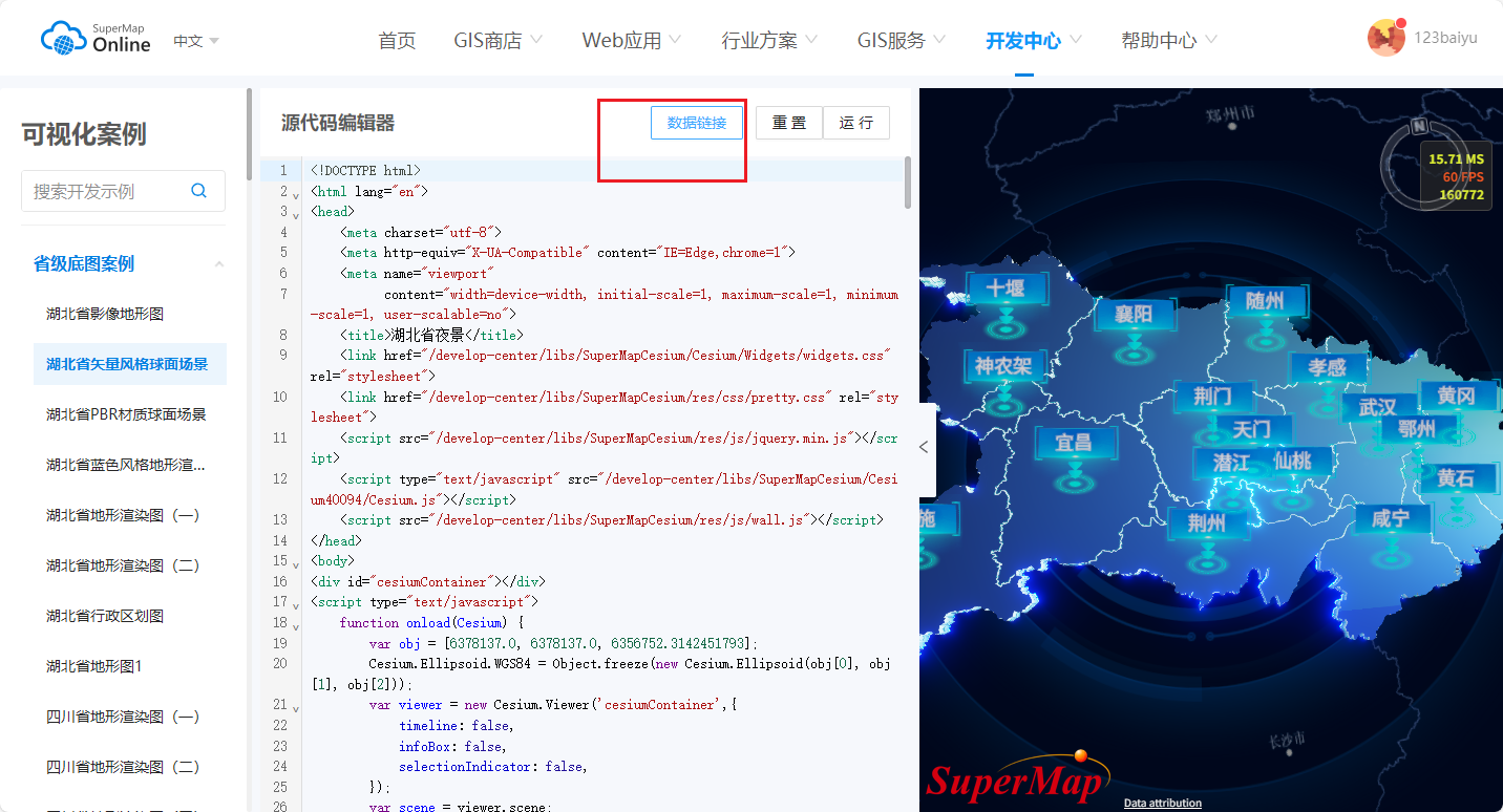 这种效果在supermap online网站,开发中心-可视化案例里面有类似的效果,例如下面这种,可以进行数据链接下载,其中包含了所有数据、代码以及使用说明,可以参考“使用必读”文件的内容进行学习和部署。
