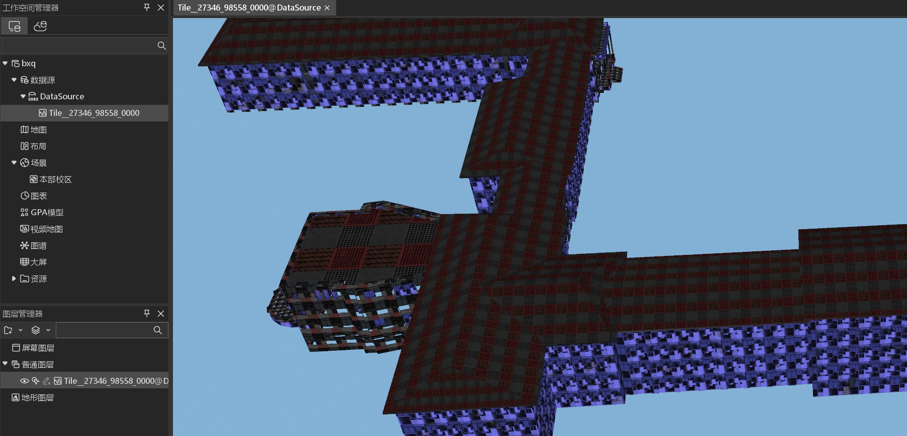 将手工精模三维切片缓存导入到数据集后,加载到平面场景中,显示效果为上图,纹理都花了,没法使用