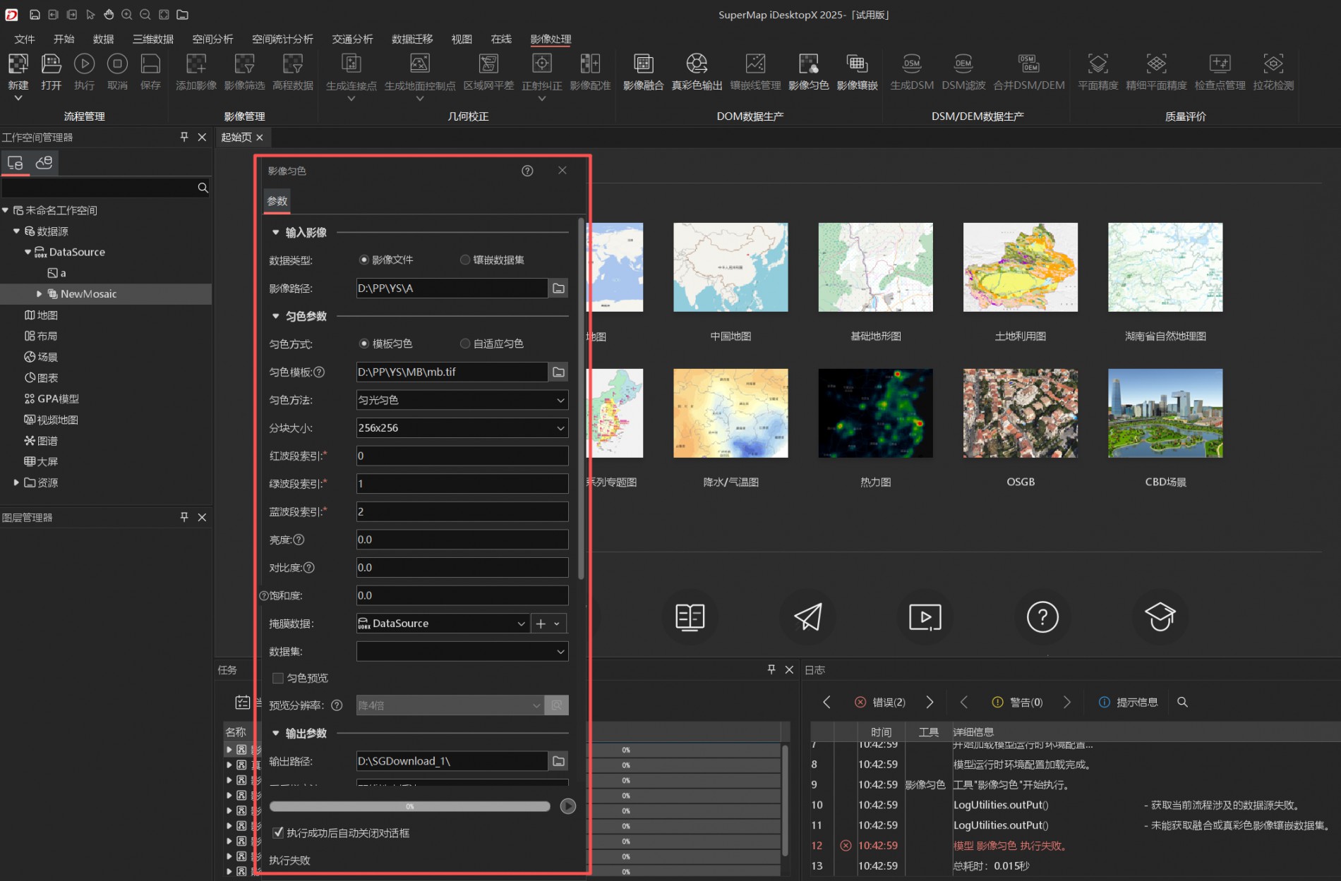【解决办法】1、在使用影像匀色前需新建/打开遥感工作空间; 2、使用匀光匀色方法时要求影像模板范围完全包含输入影像范围,如果仅存在相交关系,建议使用自适应匀色或颜色映射匀色方法。