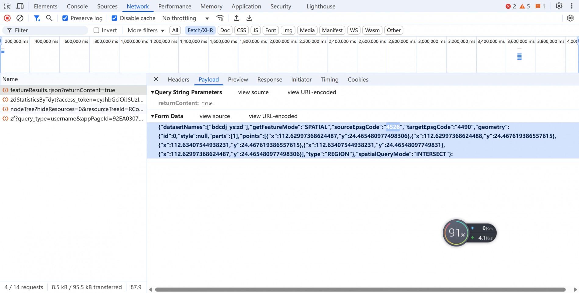 使用 iServer 的数据服务进行空间相交查询,设置了 sourceEpsgCode: 4526,但是返回结果为null,该问题如何解决?