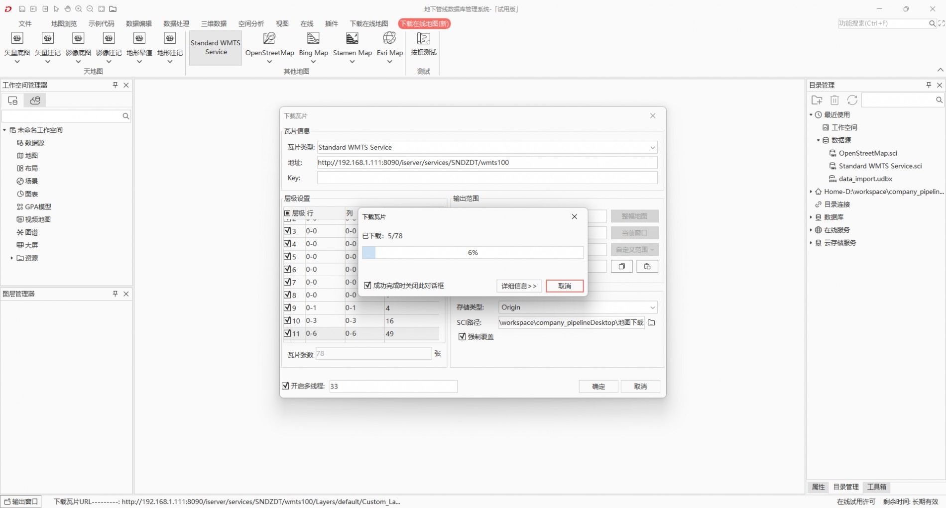 你好,我在使用SuperMap iDesktop软件(12i)的“下载在线地图”功能时遇到问题,无法完整下载指定的WMTS服务瓦片。内置的天地图是可以任选层级且能正常下载的。瓦片类型是WMTS,输入地址后,选择层级。瓦片下载只能够下载几张,下载进度页面就卡在这不动了。(是因为超图的瓦片下载解析WMTS的范围错了吗)希望能协助排查。