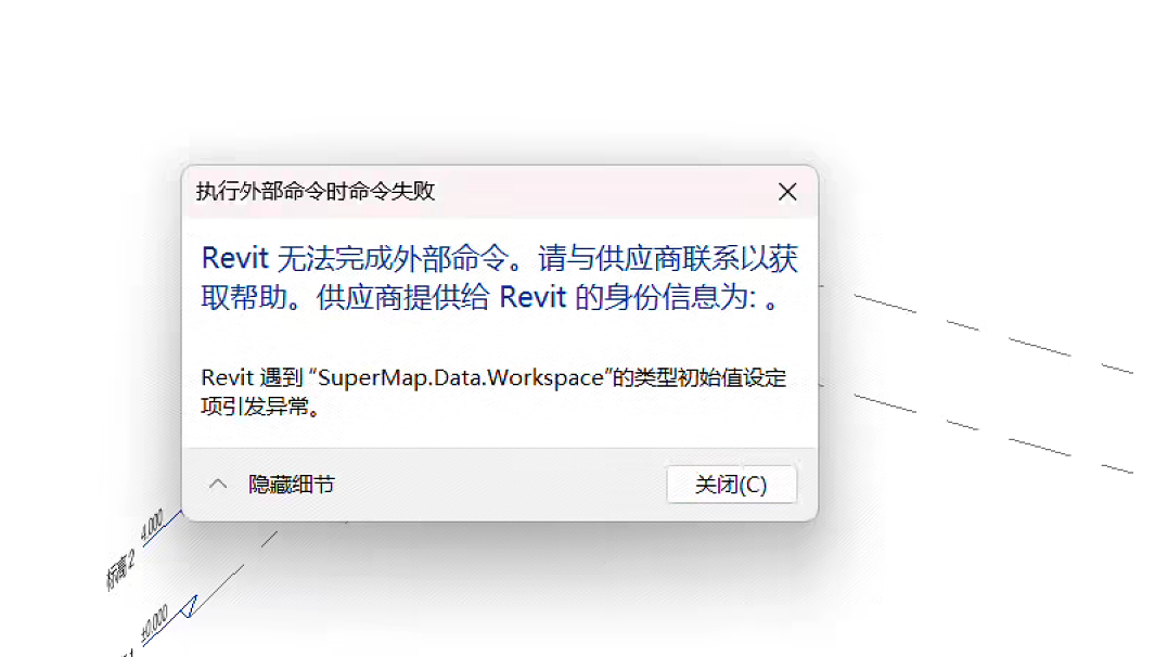 【问题原因】设备存在12i的许可,使用revit插件导出模型报错"Revit 遇到"SuperMap.Data.Workspace”的类型初始值设定 项引发异常。",排查出是在配置插件时使用个11i的bin包 【解决办法】一下方案任选其一:1.申请11i的本地许可,配置好许可后可正常使用插件. 2.推荐使用 Supermap iDesktopX 12i,可直接导入.rvt文件,无需插件