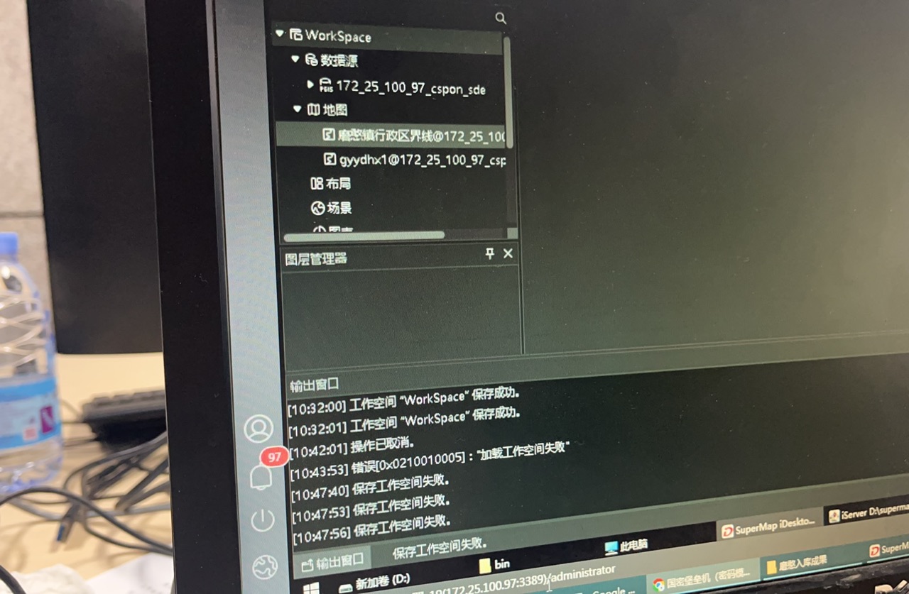 【问题原因】用户在保存到数据库工作空间还在工作时中断了保存,导致数据库锁起来了,数据库中断机制导致后续拒绝响应后续操作 【解决办法】先保存一份新的文件型工作空间到本地,关闭软件,重新打开工作空间,选择另存为postgis工作空间,配置正确的新的工作空间名字,最后删除旧的出错的工作空间