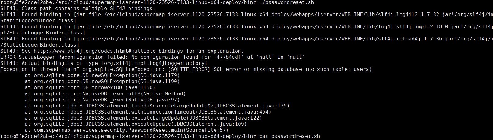 已经找到了容器中的目录在/etc/icloud下面,但是执行时passwordreset.sh时报错,没有users这张表。具体错误如下